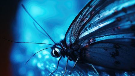 Detailed view of a otherworldly butterfly on a vibrant blue background, showing intricate glowing wings. Created with Generative AI