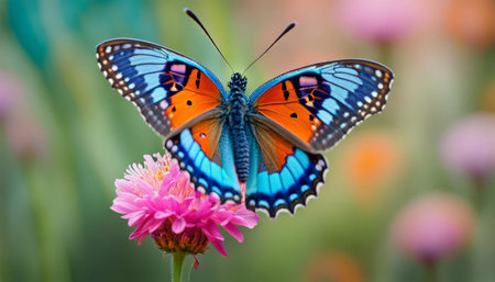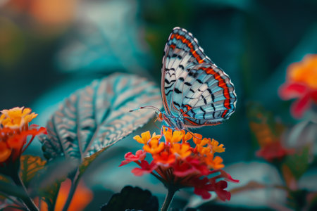 A colorful butterfly gracefully spreads its wings while resting on a vibrant flower in a serene garden. Natural light enhances the delicate textures and bright colors, creating a stunning display.