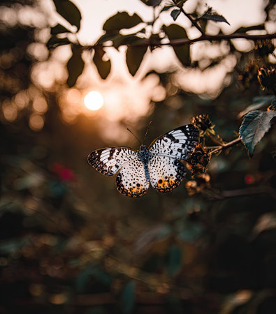 A detailed photograph captures a butterfly resting on a branch, showcasing a mix of black and white patterns on its wings. The image features a shallow depth of field, with soft focus leaves and sunlight bokeh in the background, creating a warm and natural atmosphere. This image could be used for various commercial or editorial purposes.