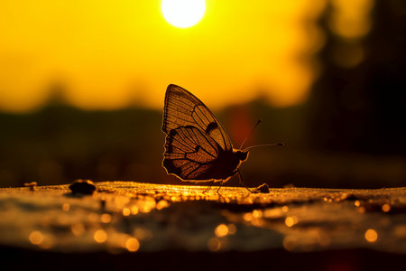 Silhouette of butterfly on the wooden floor with sunset background.