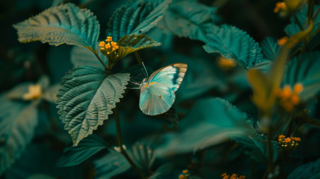 A delicate butterfly with blue and yellow markings resting on a leaf surrounded by vibrant foliage and small yellow flowers.