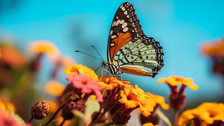 Generative AI : Beautiful spring summer image of monarch butterfly on orange lantana flower against blue sky on bright sunny day in nature macro