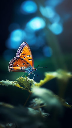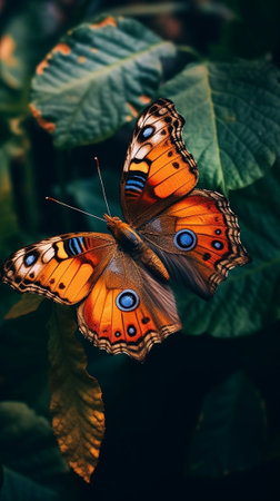 A vibrant butterfly with intricate wing patterns gently perched on coarse, lush foliage, evoking a peaceful, nature-inspired scene perfect for spring