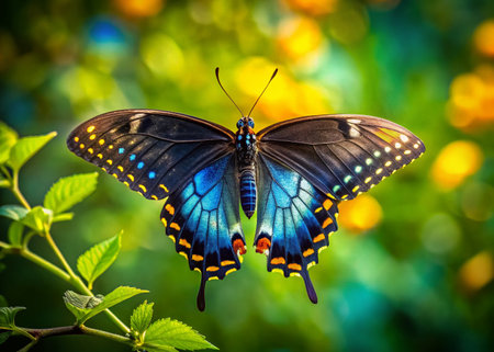 Colorful butterfly perched on a green leaf, nature close-up. Wildlife and beauty concept