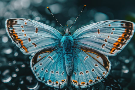Extreme photograph captures a small, pale blue butterfly with subtle orange markings on its wings, delicately perched near the edge of a reflective, wet surface. The background is dominated by a deep teal and dark blue ambiance, dramatically illuminated by out-of-focus, warm, circular bokeh lights creating a magical, glowing atmosphere.
