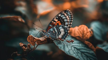 A vivid butterfly resting on a leaf, accompanied by a small ant. This serene moment captures the beauty of nature, showcasing intricate details and vibrant colors.