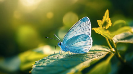 A close-up of a light blue butterfly resting on a green leaf, its delicate wings glowing in the sunlight.