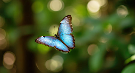 Vibrant Blue Morpho Butterfly Flying Freely Through Sunlit Rainforest Opening With Wings Extended