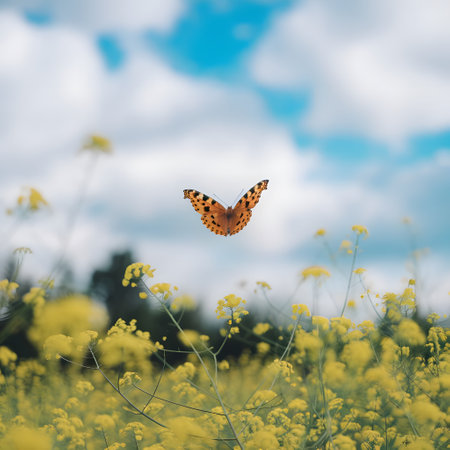 A delicate butterfly rests gently on wildflowers in a peaceful meadow. Soft light bathes the scene.