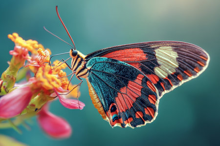 Macro shot of a colorful butterfly perched on a vibrant flower, with detailed wings in focus