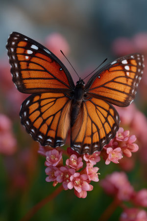 A viceroy butterfly perched on pink flowers.