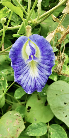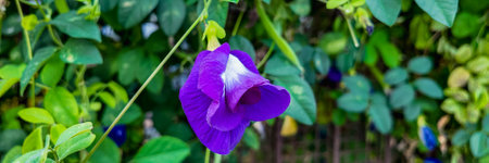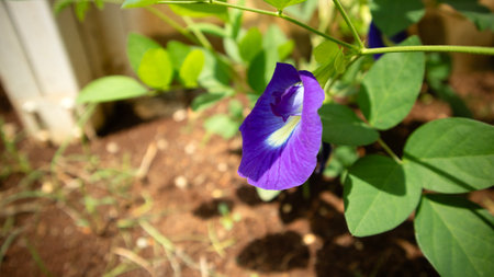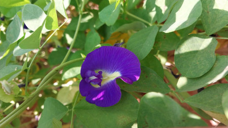 Vibrant butterfly pea flower with green leaves growing under sunlight in backyard garden