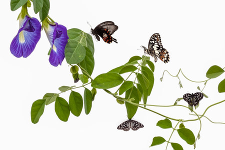 Butterfly and Butterfly on Butterfly Pea flower isolated on white background