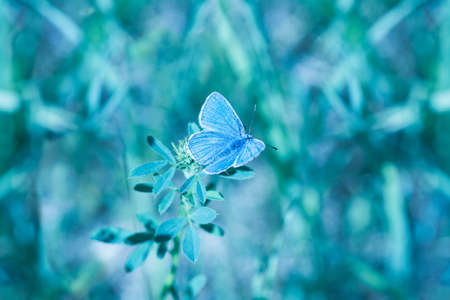 Wild meadow grass and butterfly in spring in nature macro. Blue toned image.