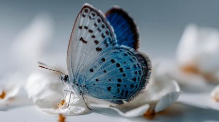 A fragile blue butterfly gently perches on smooth white petals beneath soft daylight, showing elaborate wing details against a tranquil, out-of-focus backdrop.
