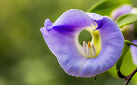 Close-up of butterfly pea flower. Clitoria ternatea. Blooming flower and green leaves. Plant with herbal benefits. Natural background for health themes, tropical gardens and traditional medicine