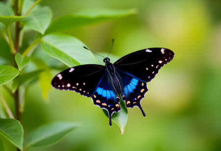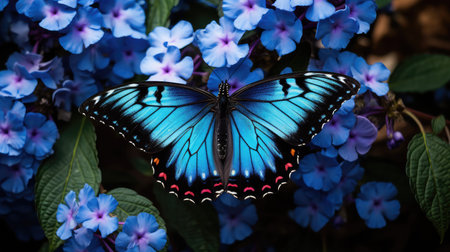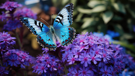 blue butterfly perched delicately on a flower, adorned with glistening water droplets. this captivating 8k resolution photograph, captured by charles spencelayh for national geographic, showcases a fusion of japanese traditional art influence. the vibrant colors of light magenta and white bring the lively nature scene to life, resulting in a high-quality masterpiece. ai generated