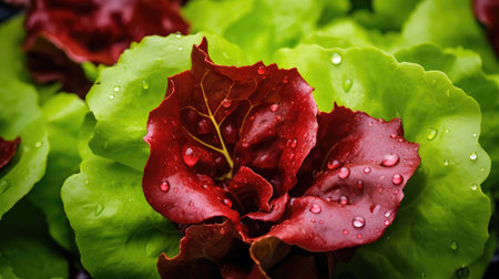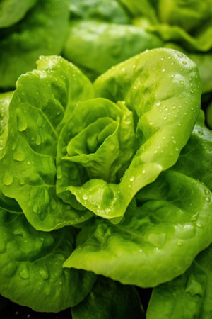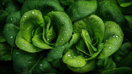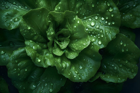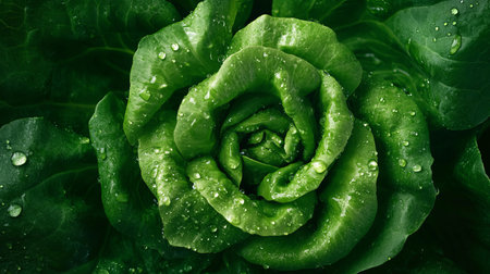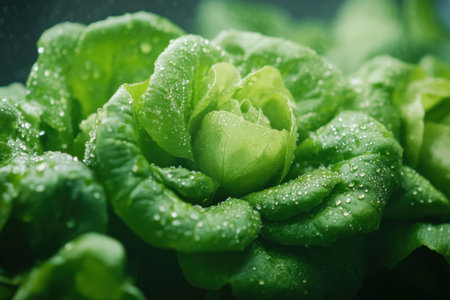 Close-up of fresh green lettuce leaves adorned with water droplets, showcasing the vibrant colors and textures. Perfect for themes related to health, nutrition, and organic living.