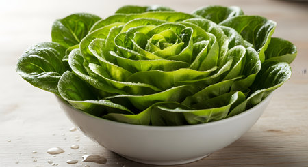 A fresh head of green butterhead lettuce covered in water droplets in a white bowl. The crisp leaves and moisture highlight freshness, organic farming, and healthy salad ingredients.