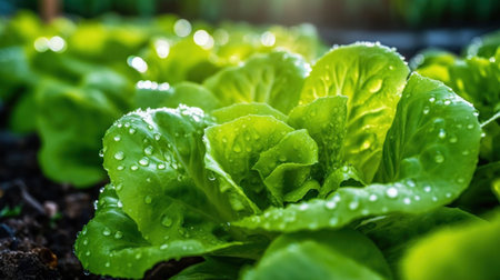 Vibrant green lettuce leaves display dew droplets, reflecting freshness in a flourishing garden environment at dawn.