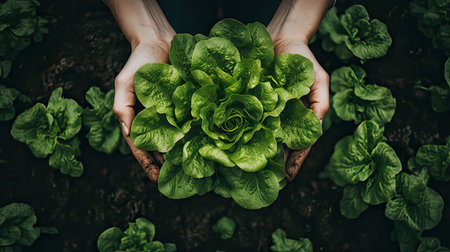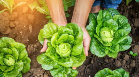Abundance of Fresh Green Lettuce Grasped in Hands, Thriving in Nurturing Garden Soil