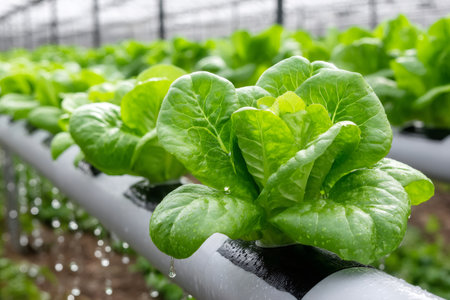 Fresh butterhead lettuce growing in a hydroponic system with water drops falling from PVC pipes in a greenhouse