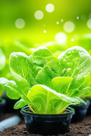 Water droplets gently envelop the lush greens, highlighting their vivid color and vitality. This innovative approach nurtures healthy growth in a sustainable greenhouse setting.