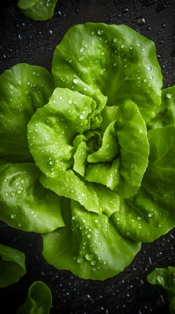 A vibrant head of fresh green lettuce leaves on a dark background, perfect for illustrating healthy eating, cooking, or vegan cuisine in culinary projects.
