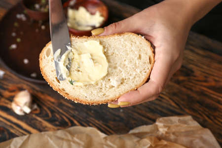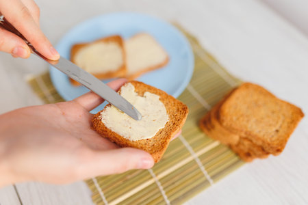 Close up of female butter the rye toasted bread by vegan butter. Woman butter toast at home on wooden board
