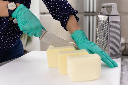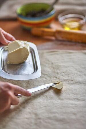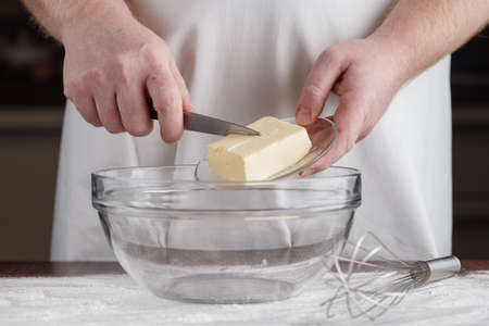 hands cutting butter with a red knife in a kitchen with unfocused background utensils. Concept of cooking, pastry.