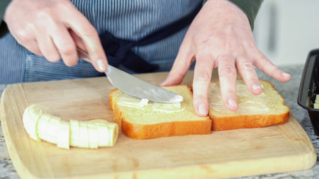 In a modern white kitchen, buttered banana and brioche bread are being prepared for making a delicious grilled peanut butter banana sandwich.