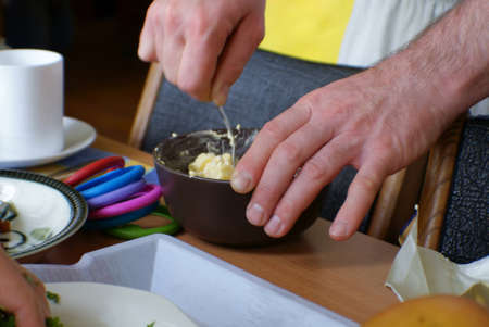 Outdoor extreme closeup of little girl mixing sour cream with butter knife and going to eat with bread. Outdoor food photoshoot.