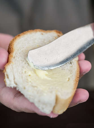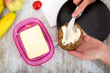 Spreading butter on bread. Womans hands making sandwich with bread and butter