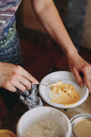 Chef holding Butter. cheesemaker hands holds Butter. Food recipe background. close up.