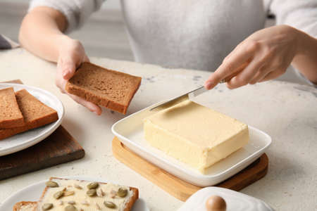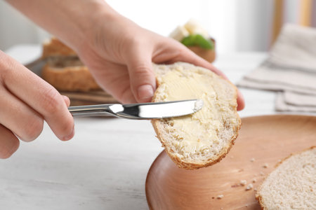 Woman spreading butter onto slice of fresh bread on light background, closeup