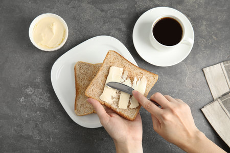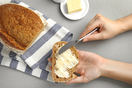 Woman spreading tasty butter onto bread over plate at gray table, top view