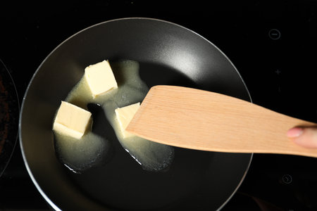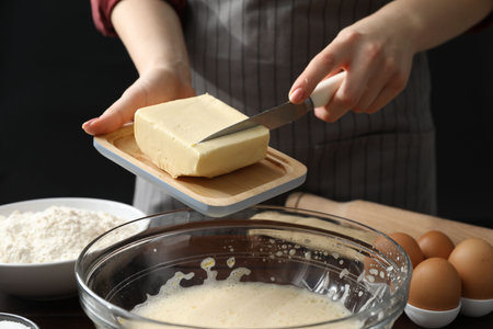 The dough preparation process. Female hands add butter into the mixing bowl for baking cake on a black background. Homemade recipe of pastry.