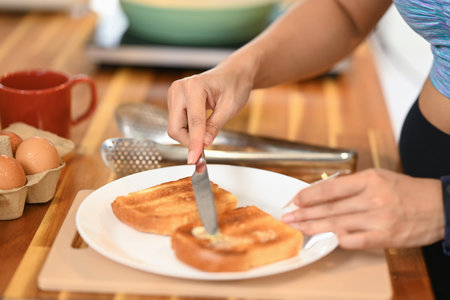 Close up shot of woman spreading butter on toasted bread with a cutlery knife.