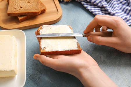 Female hand butters toasts for breakfast on the grey slate background. Horizontal view