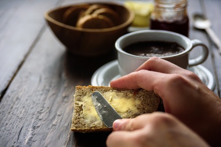A close-up of hands spreading butter on a slice of toasted bread, symbolizing a healthy and delicious breakfast choice.