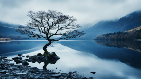 A bare tree on the LLyn Padarn lake at Llanberis in the Snowdonia area of North Wales UK