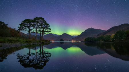 A breathtaking night scene showcases the vibrant aurora borealis over a serene lake, surrounded by majestic mountains and silhouetted trees.