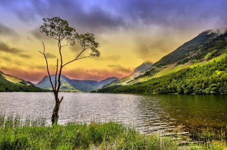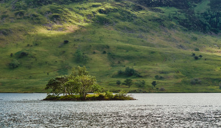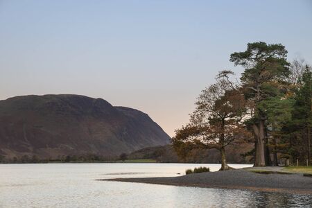 Shoreline of Crummock Water with a small Tree and stone wall.Crummock water is one of the lakes located in the Lake District National Park in the County of Cumbria,North West England,UK.