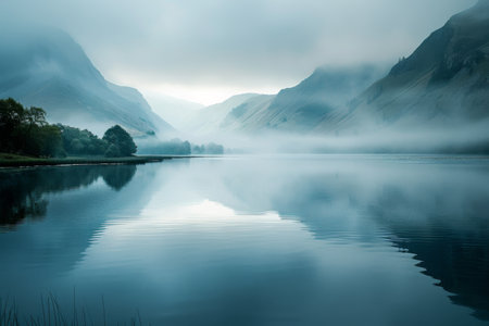 Dawn mist rises around Buttermere, the lake in the English Lake District in North West England. The adjacent village of Buttermere takes its name from the lake. Historically in Cumberland, the lake is now within the county of Cumbria. It is owned by the National Trust, forming part of its Buttermere and Ennerdale property
