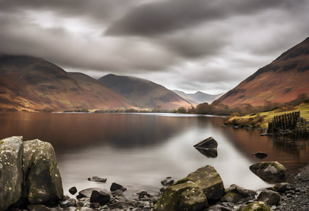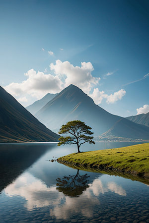 Witness nature's masterwork unfold in the picturesque splendor of the Lake District, where tranquil lakes, rugged mountains, and idyllic villages harmonize in a captivating tapestry that showcases the UK's most scenic landscapes. AI-generated