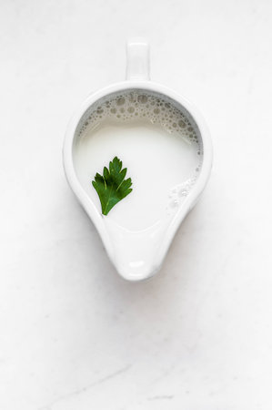 Enjoy a delectable and refreshing glass of creamy milk topped with a sprig of mint, perfect for culinary photography, recipes, and gastronomic delights.