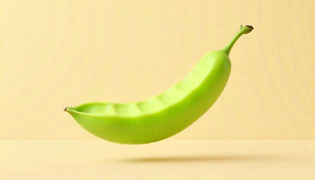 Single green pea pod floating against a cream backdrop