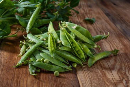 Ripe green peas on a wooden surface for cooking