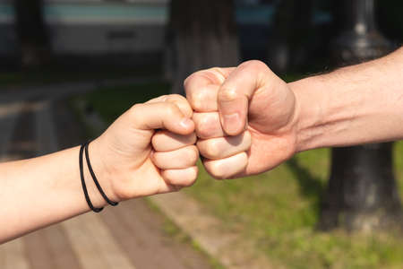 fist bump close-up. young people say hello fist outdoors fist. friendship. youth. a game