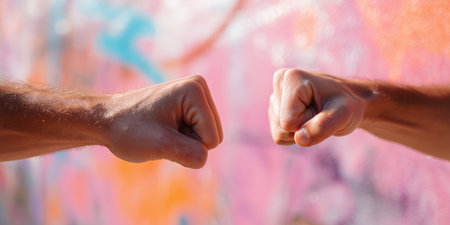 Two hands make a fist in front of a colorful wall during a casual encounter